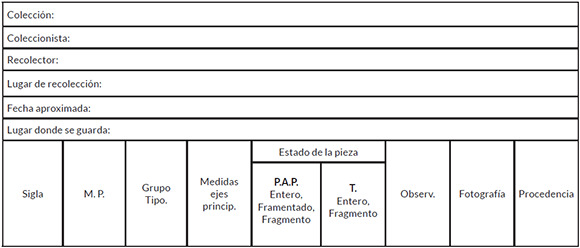 - Sigla: cada pieza fue clasificada según un número de repositorio creado para los fines analíticos de la investigación. Ninguna colección tenía confeccionado un inventario propio, motivo por el cual se clasificó cada pieza según la letra inicial del nombre de la colección y con número continuos (por ejemplo: G1, objeto 1 de la colección Gómez). - Materia prima: la identificación de materias primas se basó en el análisis macroscópico de cada objeto. - Grupo tipológico: la clasificación tipológica se estableció según los trabajos de Aschero (1975, 1983) y Vecchi (2010a). - Medidas de los ejes principales: las piezas fueron medidas con un calibre manual considerando el eje longitudinal y transversal. Sin embargo, específicamente para las bolas de boleadoras se consideró a Vecchi (2010a), quien toma el eje mayor de la pieza como diámetro 1 en los casos de piezas sin surco y en las piezas que lo presentan, como diámetro 1 a aquel paralelo al surco. - Estado de la pieza: para los objetos que fueron confeccionados mediante picado, abradido y pulido (P.A.P.), se consideró si se encuentra entero, fragmentado si presentan más del 51% del total de su volumen, o fragmento cuando el volumen es menor al 50%. Para las piezas talladas (T.) se registra si están enteras o fragmentadas. - Observaciones: allí se vuelca toda la información que resultó significativa al momento del registro en relación con cada pieza. - Fotografía: cada objeto en particular fue fotografiado con una cámara digital y escala. - Procedencia: se indica el lugar dónde fue recolectado cada objeto cuando tiene procedencia registrada particular.