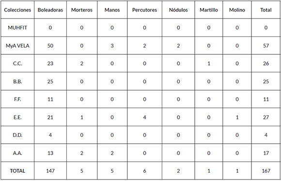 Del total de 167 materiales realizados mediante P.A.P, 147 corresponden a bolas de boleadoras, es decir, el 88,62%. Mientras que la distribución tipológica en el grupo de los materiales tallados se presenta más homogénea Tablas 3 y 4).