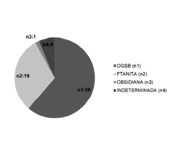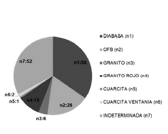 Si analizamos las proporciones entre las distintas materias primas líticas (Figuras 4 y 5), vemos que el 61,29% del material tallado fue confeccionado en OGSB, seguido por el 30,64% sobre ftanita y el resto se distribuye entre la única pieza de obsidiana y cuatro indeterminadas. En cuanto al material P. A. P., el 34,59% está manufacturado en diabasa, el 17,61% en OFB, y el 32,70% corresponde a la categoría indeterminado. El resto del porcentaje se distribuye entre granito, cuarcita, cuarcita de Ventania y granito rojo, siendo esta última materia prima la de mayor proporción en relación con las otras tres. Sin embargo, como bien destaca Vecchi (2010b), las etapas de formatización de las bolas de boleadoras producen una gran alteración en la superficie de estos instrumentos, situación que imposibilita una determinación macroscópica precisa. No obstante, vemos que los porcentajes de materias primas líticas se corresponden con los encontrados en los sitios arqueológicos prehispánicos de la zona y guardan relación con las distancias a las canteras/fuentes de aprovisionamiento de cada roca (Flegenheimer y Bayón 2002; Vecchi 2010a; Colombo 2013).
