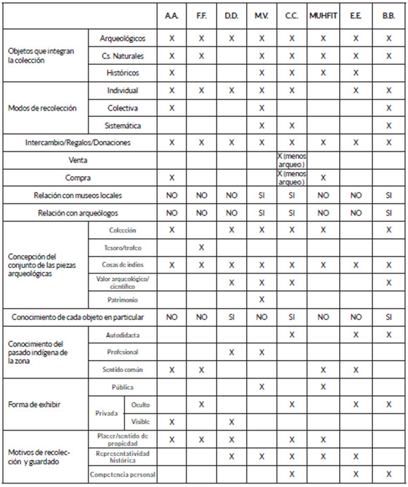 Las otras seis colecciones están bajo custodia de coleccionistas y aficionados locales, cuatro hombres y dos mujeres. Cada uno de ellos y ellas construyó redes de relaciones sociales, institucionales y académicas distintas, generando así, prácticas coleccionistas particulares y dinámicas (Arislur 2017).
