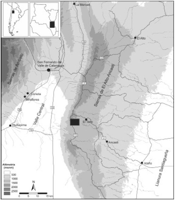 La Sierra de El Alto-Ancasti, provincia de Catamarca, se extiende más o menos en sentido norte-sur, entre los 28º y 29º de latitud sur y los 63º y 65º 30’ de longitud oeste (Figura 1). A lo ancho de sus casi 170 km de largo, se pueden distinguir tres pisos altitudinales claramente diferenciados en cuanto a la vegetación presente: Bosque Serrano (desde los 700 a los 1500 msnm), Arbustal-Pastizal (entre los 1500 y 2000 msnm) y, por último, Pastizal de Altura (sobre los 1500 msnm) (Morlans 1995).