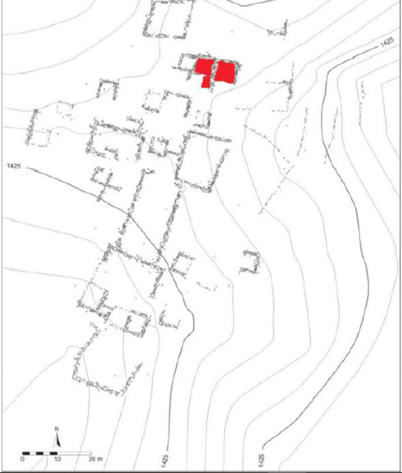 Figura 2. Conjunto habitacional ET19, en rojo el área excavada (R1, R2 y R3). Figura tomada y modificada de Quesada et al. (2012).