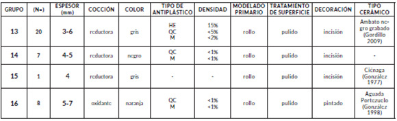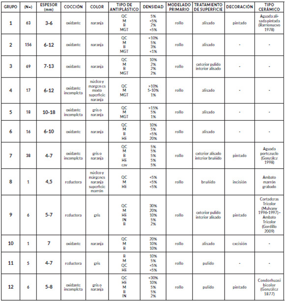 Tabla 1.Características tecnológicas de los grupos cerámicos definidos para El Taco 19.