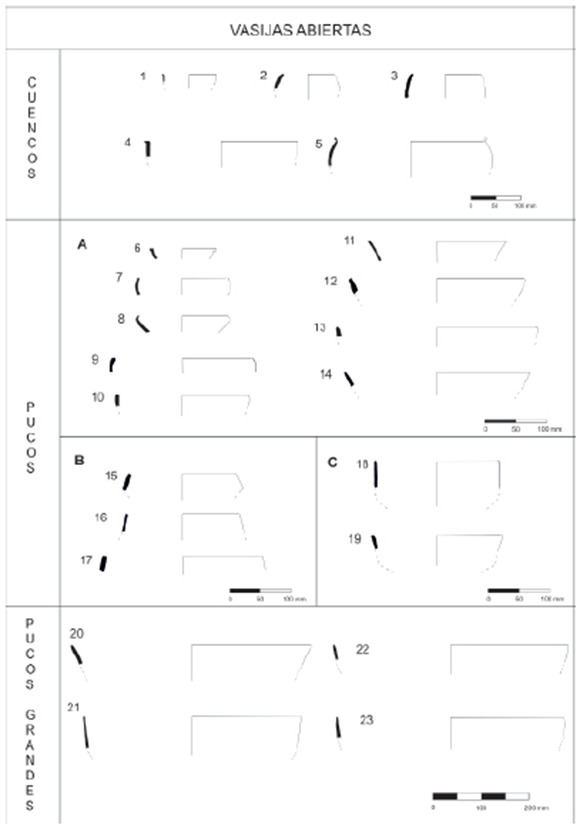 Como mostramos anteriormente, se pudieron identificar tres tipos de vasijas abiertas: cuencos, pucos y pucos grandes. Consideramos que la principal característica que distingue a este conjunto reside en la alta accesibilidad física y visual al contenido. Si bien no podemos conocer específicamente la capacidad, es decir, el volumen que puede ser contenido, si podemos mencionar que existe una alta variabilidad en el tamaño de estas vasijas (desde los 10 hasta los 50 cm de diámetro máximo) (Figura 4). A pesar de la no identificación de elementos de agarre, como asas, consideramos que serían de fácil trasporte debido a lo reducido de sus tamaños (con excepción de los pucos grandes). Por último, desconocemos el nivel de estabilidad de este conjunto debido a la ausencia de bases.