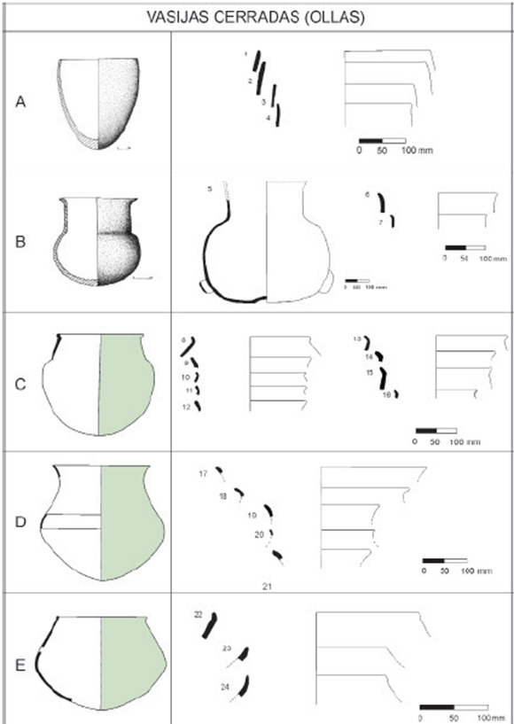 • Forma E: “restringida dependiente, de contorno complejo (olla). Cuerpo: combinación de sección de ovoide y cono. Borde: evertido, con engrosa- miento gradual externo. Labio: convexo. Base: convexo-cóncavo (indiferenciada)” (Mulvany 1978:113-114).