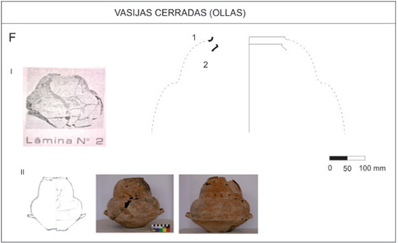 • Forma F: combinación de un cuerpo globular y un cuello cilíndrico, el cual ofrece un perfil levemente convexo y borde evertido, rematado en un labio recto de aspecto irregular. También presenta asas de tipo horizontal remachadas por arriba del punto de inflexión entre el cuello y el cuerpo (Nazar y De La Fuente 2016).