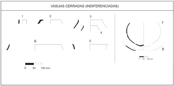 • Vasijas cerradas indiferenciadas de pasta gruesa (n=3): pudieron servir tanto para almacenar como para procesar sólidos y líquidos, fríos y calientes.