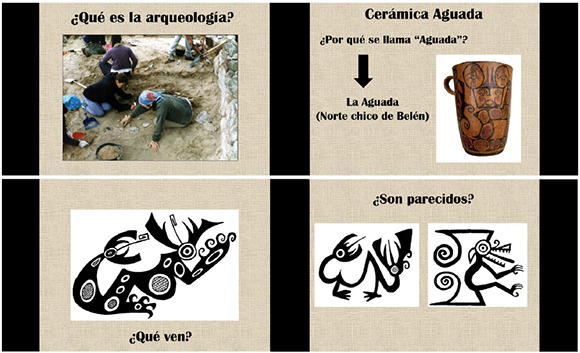 Siguiendo con la presentación, mostramos imágenes con las representaciones Aguada y de otras sociedades, con el fin de que compararan unas con otras y nos transmitieran su opinión acerca de su interpretación y sus semejanzas. En sus interpretaciones veían animales que bien podrían ser las mascotas de los “indios” (término usado por los propios niños y niñas) o sus dioses (hicieron referencia a dioses de la plantación o de los pastores), a “Chucky” el muñeco, o a un “viejito”. A través de estas interpretaciones nos demostraron que, tanto estudiantes como docentes, tenían presente que el lugar que hoy habitan antes estuvo ocupado por sociedades diferentes a la actual.