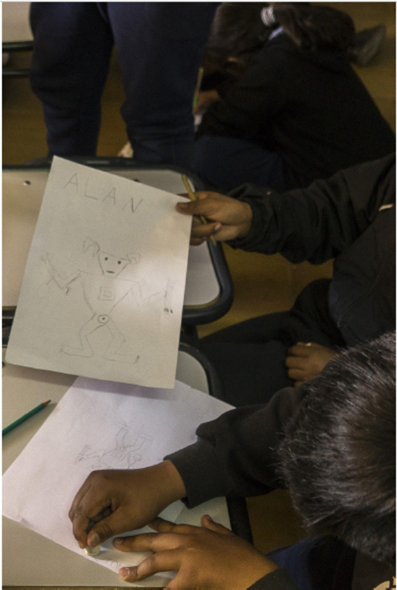 Días antes del viaje, en una nueva reunión se elaboró una presentación digital con diapositivas, se discutieron los detalles de la exposición y se planificó la actividad de cierre, que consistiría en la realización de un dibujo por parte de los/las niño/as. Esta decisión se basó en las experiencias de años anteriores, en las que únicamente se había promovido la participación oral. A partir de la propuesta del dibujo se buscó lograr la participación de todo el grupo en la actividad, y la elección de la iconografía Aguada como modelo tuvo como objetivo atraer el interés de niño/as en el patrimonio arqueológico local, apelando a un ejercicio comparativo en función de la similitud de este estilo con otras representaciones andinas de Chile, Bolivia y Perú. La Aguada es un poblado del norte de Belén, muy próximo a las escuelas de Puerta de San José, y el nombre dado a la entidad arqueológica Aguada deriva de allí. La comparación con las figuras de otros lugares muy lejanos permitiría facilitar su ubicación en un contexto espacial y temporal, y a la vez darle relevancia como expresión andina frente a otras expresiones culturales conocidas como Moche y Tiwanaku; además, los tipos de figuras representadas permiten un juego de sentidos muy atractivo, ya que son imágenes que mezclan rasgos naturalistas, fantásticos y abstractos.