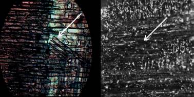 Figura 3. Muestra de referencia (izq.) de Schinus sp. y arqueológico (der.).Plano tangencial a 400X donde se visualizan los canales resiníferos característicos.