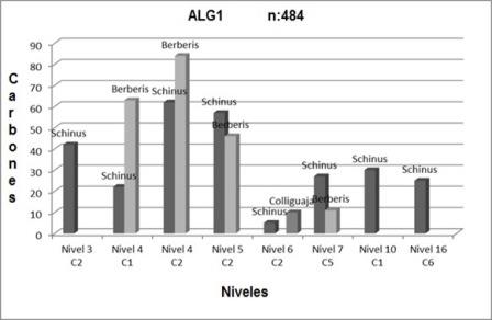 A nivel general, los géneros identificados en ALG1, independientemente de su hallazgo en la estratigrafía, son carbones arqueológicos de tres taxones: Berberis, Schinus y Colliguaja (Figuras 2, 3 y 4).