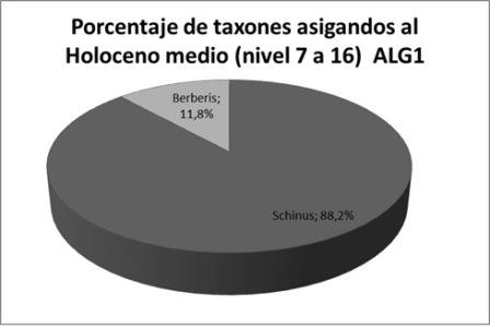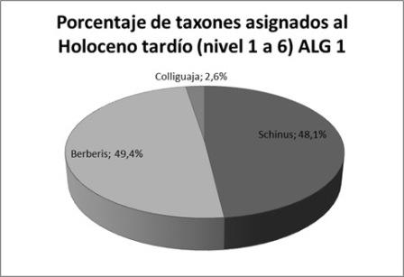 En las muestras contextualizadas dentro del Holoceno tardío (Figura 6), están representados los géneros Schinus, Berberis y en menor proporción Colliguaja. Los porcentajes de Schinus sp. y Berberis sp. son prácticamente similares, aunque se observa un ligero predominio del último. No obstante, se entiende que una ampliación futura de la muestra podría arrojar un resultado más a favor para uno u otro de estos dos géneros. Lo importante entonces aquí es que los dos géneros se encuentran presentes en proporciones similares.