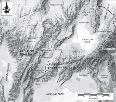 Figura 1. Mapa del valle de Hualfín (Departamento de Belén, Catamarca) con la ubicación de la
