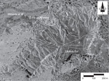 Figura 2. Imagen satelital del Cerrito Colorado de La Ciénaga de Arriba, con la indicación de la división en sectores.