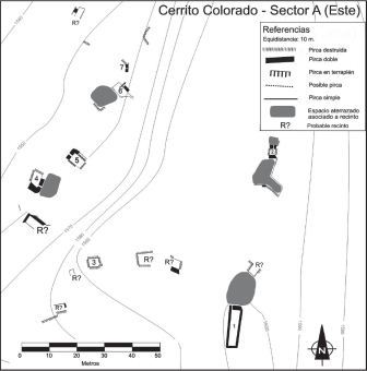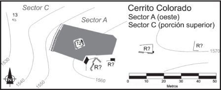 - Se identificaron 19 recintos en Cerrito Colorado. Todos ellos rodeados por espacios aterrazados, aplanados artificialmente y con muros de contención. En el sector A se destaca la posición, dimensión y técnica constructiva del Recinto 1. Este se ubica en la cima del cerro, con un tamaño que por lo menos duplica al resto de los recintos representados en las figuras (exceptuando el Recinto 8), siendo el único construido en su totalidad con una técnica de muro doble ¿Cómo es considerada esa diferencia en la accesibilidad, en el emplazamiento y en el tamaño? ¿Pudo tratarse de un espacio de congregación restringido?