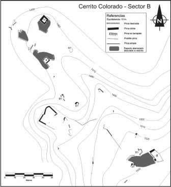 En cuanto a la cantidad de recintos identificados (19), el Cerrito Colorado presenta un número bajo en relación a otros sitios del valle (Wynveldt 2009). Además, todos se encuentran aislados. Debe tenerse en cuenta, sin embargo, que existen pircas aisladas o grupos de dos o tres paredes formando ángulos, que dan la pauta de la presencia de una mayor cantidad de recintos. Se observan también, alrededor de algunos de ellos, espacios aterrazados formados por muros de contención. Por otro lado, se hallaron dos cistas circulares posiblemente funerarias.