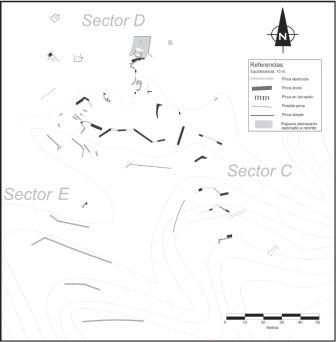 �nicamente con fines descriptivos hemos segmentado al sitio en cinco sectores a los que denominamos: A (recintos 1, 2, 3, 4, 5, 6, 7 y 12), B (recintos 8, 9 10 y 11), C (recintos 13 y 14), D (15, 16, 17, 18 y 19) y E (s�lo muros y estructuras de contenci�n). El sector A corresponde a la cima, los sectores B, C y E a tres "espolones" o "lenguas" que descienden m�s o menos abruptamente hacia la base de la loma; y el sector D, a la base misma, adyacente al acceso al sitio. En la Tabla 2 se presenta la información de los recintos por sector.