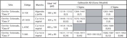 En 1975 González y Cowgill presentaron un artículo en el cual se incluían tres fechados radiocarbónicos del Cerrito Colorado (Tabla 1) realizados sobre muestras de excavación extraídas en 1952 de dos recintos. Las edades, obtenidas en tres laboratorios diferentes a fines de los años '50, fueron las siguientes: 580 ± 80 AP (U-154), 400 ± 100 AP (L-476C) y 240 ± 80 AP (Y-560) (González y Cowgill 1975). Conjuntamente fueron publicados varios fechados radiocarbónicos para diversos sitios Belén. La comparación entre las fases culturales y las edades radiocarbónicas mostraron algunas contradicciones, por lo cual los autores decidieron mantener la secuencia original sin cambios sustanciales: Belén I (1100-1300 AD), Belén II (1300-1480 AD) y Belén III (1480- 1535 AD). Posteriormente, en el marco de los proyectos del Laboratorio de Análisis Cerámico se realizó un nuevo fechado en el LATYR con los propios materiales de González del Cerrito Colorado, obteniéndose una edad de 420 ± 70 AP (LP-1810).