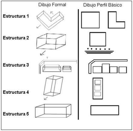 De manera general en las estructuras existe un predominio de formas cuadradas (ver Figura 3). Esta forma geométrica representa lo puro y racional, es una figura estática y neutra que carece de dirección concreta (Ching 2000). Asimismo, distinguimos la regularidad formal que prevalece, en términos de simetría y estabilidad. Por otra parte, dos estructuras del lugar (3 y 4) poseen una forma lineal, que prioriza la longitud de la estructura y tiende hacia el exterior, conformándose como espacio contenedor (Ching 2000).