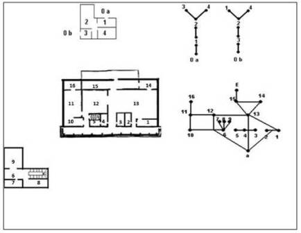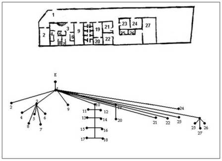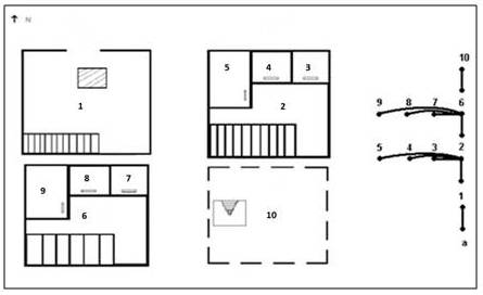 Existe una configuración del recorrido para todo el sitio que sigue un sentido esencialmente lineal y secundariamente radial, es decir, hay una organización espacial que condiciona el movimiento desde un centro (E2) hacia las demás construcciones (Figura 5).