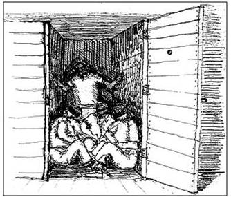 Las dimensiones de estas unidades son bastantes pequeñas. Las proporciones no nos hacen sino evidenciar la baja correspondencia existente en relación a la escala humana. Concretamente, tales dimensiones formales y espaciales impiden el desarrollo de cualquier actividad humana. De esta forma, cuando se colocaba a cinco personas en estas superficies de 1 m2, se les privaba de sus condiciones básicas de subsistencia (Figura 10). Hall (1998:72 [1966]) expresa: “…lo que uno puede hacer en un espacio dado determina su forma de sentirlo”. Claramente, en las condiciones extremas como las celdas que estudiamos, la organización represiva del espacio, no sólo corporal sino también auditiva, olfativa, etc. han impedido mantener las distancias personales mínimas establecidas por la proxémica (Figura 11).