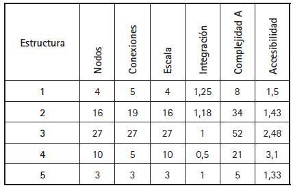 La presente tabla (Tabla 2) sintetiza los resultados del análisis en las estructuras, en cuanto a cantidad de nodos, conexiones y aplicación de los índices de Blanton (1994).