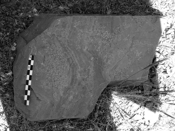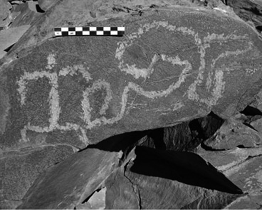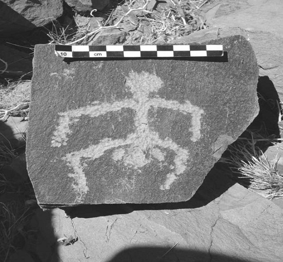 Figura 2a. Bloque grabado del sitio Campo Negro. A la izquierda de la imagen se aprecia la representación del hombre escudo de adscripción tardía (Aschero 2000) y a su lado las dos representaciones llamadas por los pobladores del lugar como hombre cóndor.