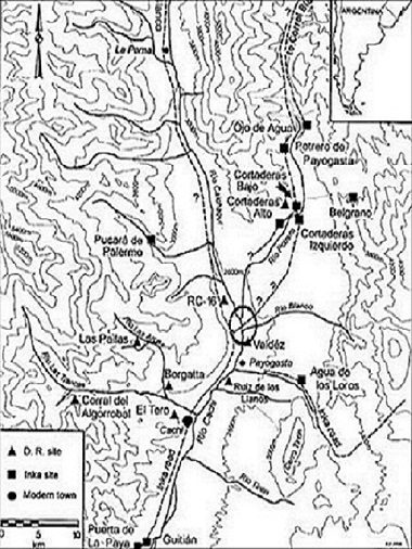 Es de destacar la ubicación del sitio Los Cerrillos ya que éste se encuentra en un espacio estratégico clave para la región. En esta porción el valle se empieza a ensanchar notablemente y el sitio se convierte en paso obligado para llegar a uno de los lugares arqueológicos más importantes de esta zona como lo es el sitio incaico de Potrero de Payogasta, así como al sitio de Cortaderas, también de filiación incaica (Acuto 1999). Si bien los incas han pasado por esta ruta, como lo indica en Los Cerrillos la presencia de una plataforma en donde se han hallado restos de cuentas y cerámica inca provincial, no se han encontrado representaciones rupestres que remitan a esta sociedad. Otro rasgo importante de Los Cerrillos es su posicionamiento en la intersección de tres ríos: Potrero, Blanco y Calchaquí. Esto podría dotar al sitio de una importancia simbólica particular ya que dentro del pensamiento andino los lugares con características geográfico-espaciales diferenciales conocidos como Taypi representan parte fundamental de la cosmogonía. En cuanto a la cultura material hallada en el sitio -además del arte en sí mismo-, se pueden mencionar apenas algunos pocos fragmentos cerámicos muy erosionados hallados en superficie.