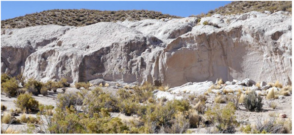Una de las fuentes de la andesita identificada se localiza en la caldera del Coranzuli, a aproximadamente 46 km al noroeste de Barrancas. Otra posible fuente, como la del volcán Rachaite, contiene flujos de lava andesíticas basálticas, además de ignimbritas dacíticas, que se encuentran a aproximadamente 30 km al norte de Barrancas (Seggiaro et al. 2015). Sin embargo, después de una inspección sobre las cartas geológicas actualizadas, se identificó una tercera fuente de andesita no registrada previamente, a menos de 10 km de Morro Blanco. Esto representaría la fuente más cercana de rocas volcánicas a la localidad.