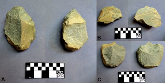 Figura 3. Instrumentos potencialmente grabadores de Morro Blanco. A: Instrumento con UTFt de filo sinuoso. B y C: Instrumentos con UTFt de buril.