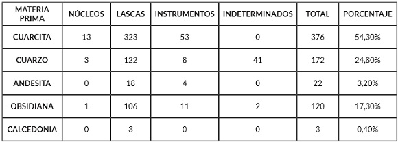 Tabla 2. Porcentaje de materias primas representadas y composición del conjunto lítico de Morro Blanco.