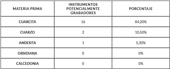 Tabla 3. Porcentaje de materias primas representadas para los instrumentos potencialmente grabadores de Morro Blanco.