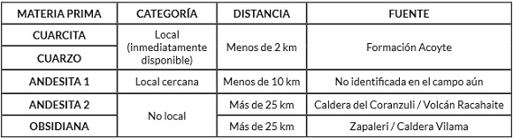 Las fuentes de materia prima que se encuentran a una distancia de hasta 25 km de los sitios se consideran locales. A su vez, según su distancia exacta, se pueden clasificar como inmediatamente disponibles si están a menos de 2 km, local cercano entre 2 y 10 km y local distante entre 10 y 25 km. Cualquier fuente que exceda los 25 km se considerará no local (Tabla 4). Esta división se debe a los rangos de acción conocidos para las poblaciones humanas en los momentos de transición entre Holoceno Medio y Tardío para la región en cuestión (Yacobaccio y Vilá 2002).