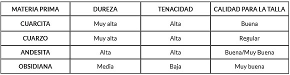 Tabla 5. Materias primas líticas y su clasificación de acuerdo a su dureza, tenacidad y calidad para la talla.