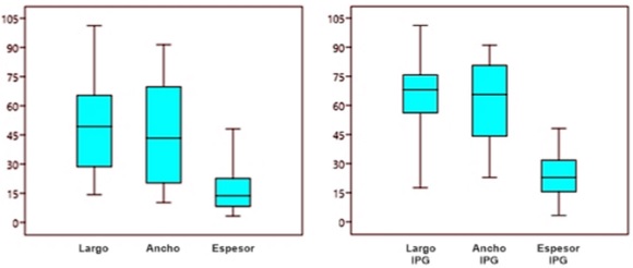 Existe, sin embargo, otro factor que podría influir en la selección de la cuarcita como materia prima para la producción de IPG: su tamaño y volumen. A partir del análisis tecnológico, se destacó que éstos parecían ser de mayor tamaño que el resto del conjunto lítico. Como consecuencia, se realizaron análisis estadísticos de boxplot teniendo en cuenta la longitud, el ancho y el espesor del conjunto lítico y luego, se tomaron las mismas medidas pero solo de los IPG. La Figura 5 revela que los mismos poseen en promedio un tamaño mayor que el resto de su conjunto correspondiente. En el caso de los IPG, se observa que el promedio en el largo de los instrumentos, tomándose los ejes tecnológicos y no morfológicos para su medición, es de 67,5 mm, su ancho es de 65 mm y su espesor es de 22,5 mm. Por otro lado, si se toman las mismas medidas en el conjunto artefactual total del sitio se observa que en promedio sus medidas de largo, ancho y espesor son de 49, 43 y 14 mm respectivamente.